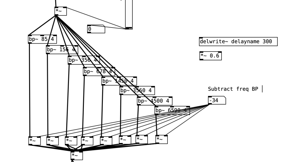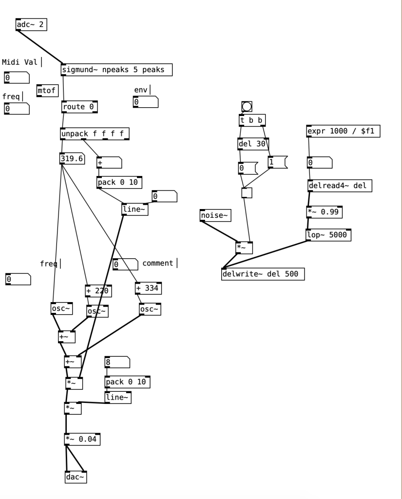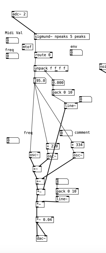Once I was able to pitch track the incoming signal, I was able to hardcode intervals above the root note which would be tracked at real time and chords would be created. In this instance I used a C major chord as the base chord so E would be 220 hz above the root note etc… I then created certain limits to the signal to weed out noise and unwanted fluctuations in the tracked pitch.