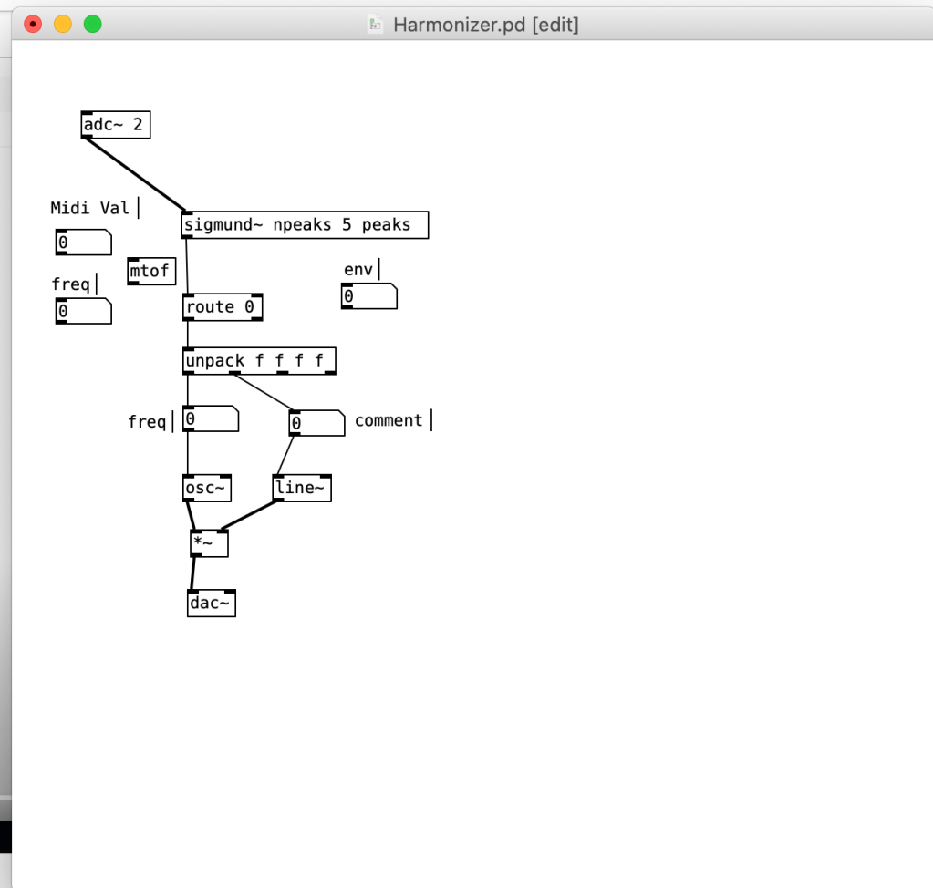 As the pitch tracking is monophonic, I was able to do this pretty easily while if polyphonic I would’ve had a way harder time. For the next week I will create a harmonizing device using preset intervals above the fundamental frequency which I will use as a base.