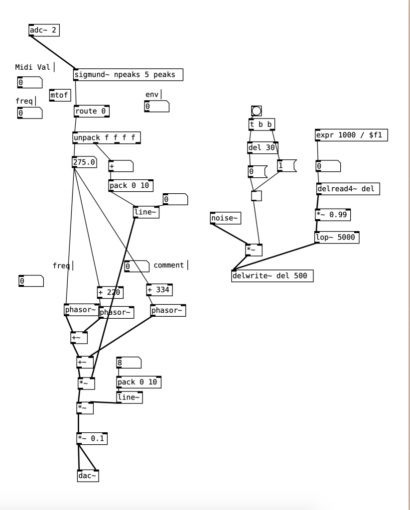 I then started working on a Karplus Strong synth to replace the sin osc. I couldn’t really figure out how to integrate this Karplus strong model into the harmonizer so I resorted to using a phasor to create the sounds.
